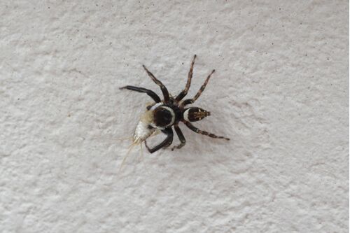 我が家のアダンソンハエトリ。大きな虫を咥えて移動していたので、正体を調べるために撮影してみたら… シミ(紙魚)という害虫でした。そういえば、数日前に室内で見かけて「なんだろ?」と思ったやつがこんな形してたかも!害虫だったとは。