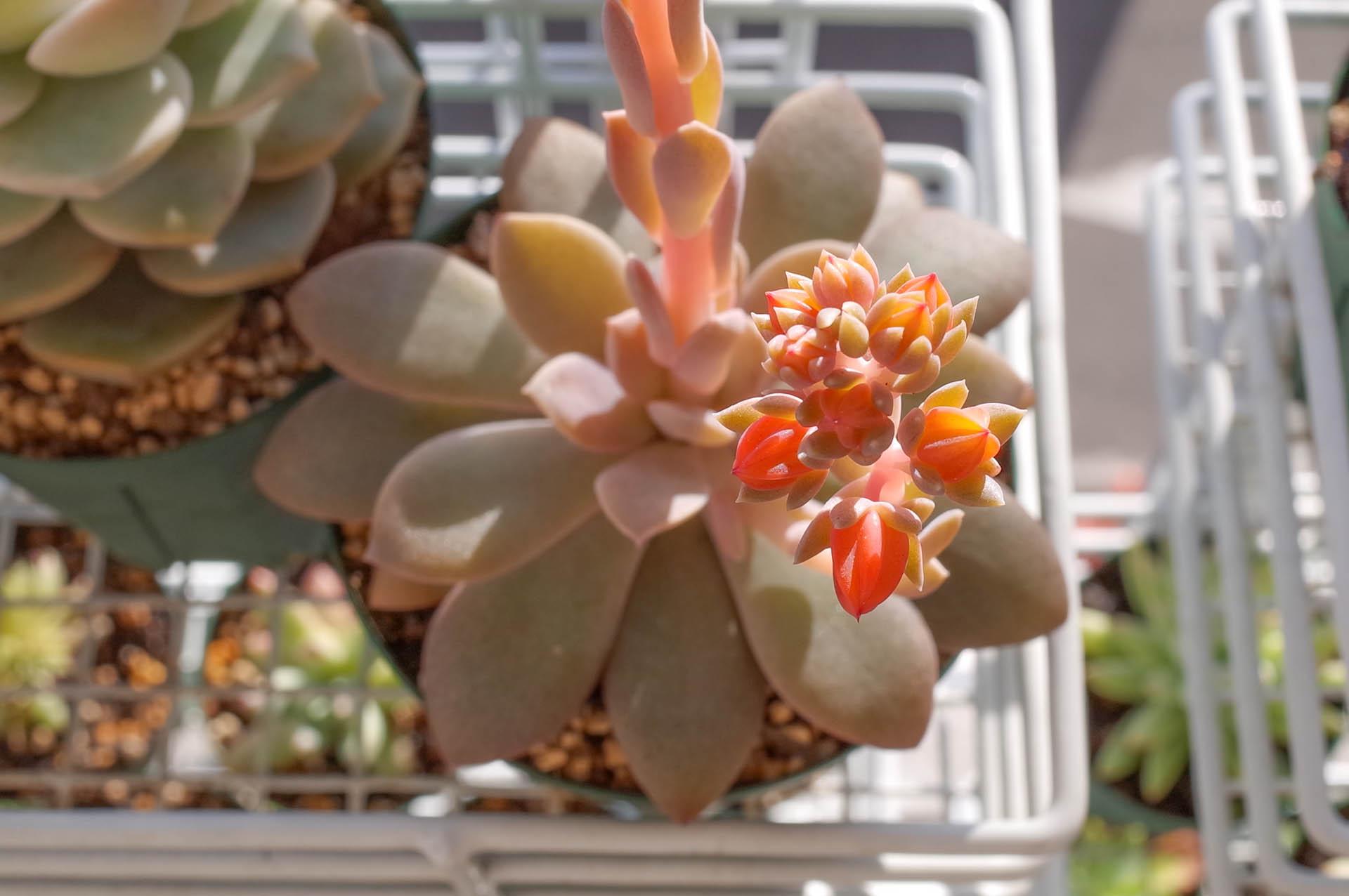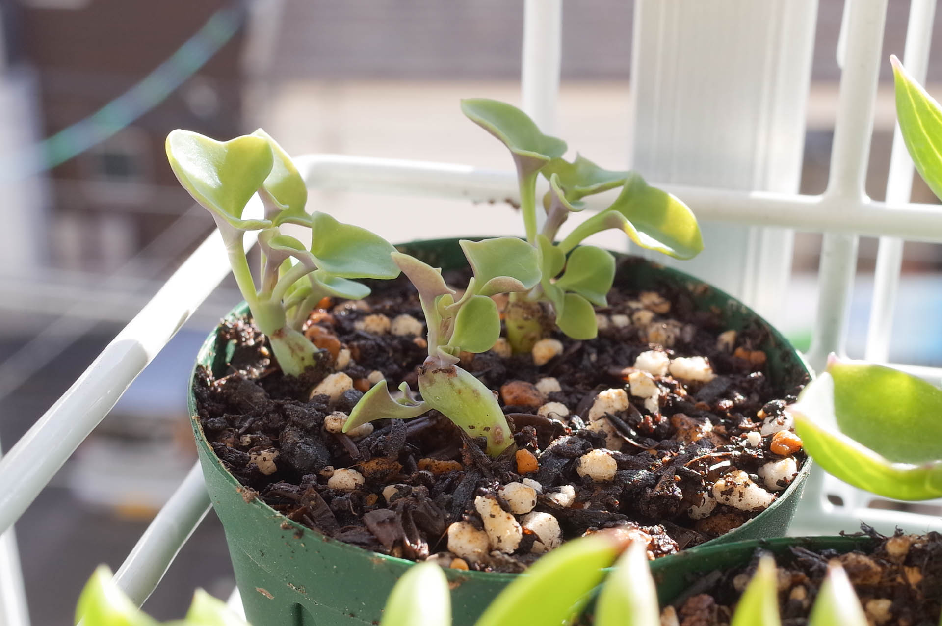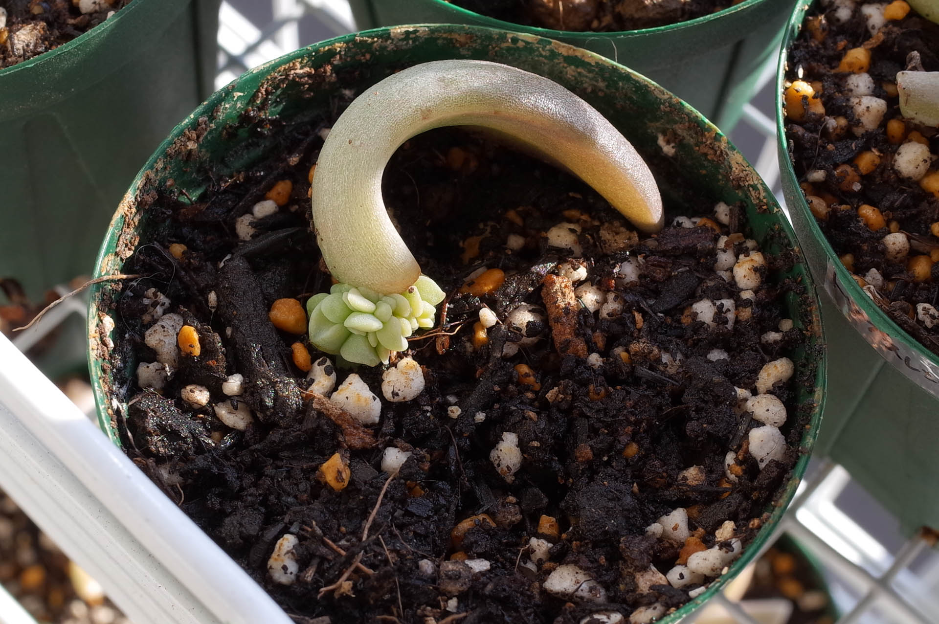 2016-12-03 七宝樹の子株 RICOH GR 多肉植物 先月、地下茎を分離して植え直した七宝樹 3本とも葉が出ました♪ 母株は花芽が伸びてきたので分離の影響はなかった模様 花芽といえば、銀明色の蕾がだいぶ膨らんできました 銀明色の葉挿し 花芽を脇芽と間違って切り落としたときに、一緒に切れてしまった葉(根元なし)をダメ元で保管していたら、しっかり根付いて芽が出ました!どんな形に成長するのか楽しみー(・∀・)