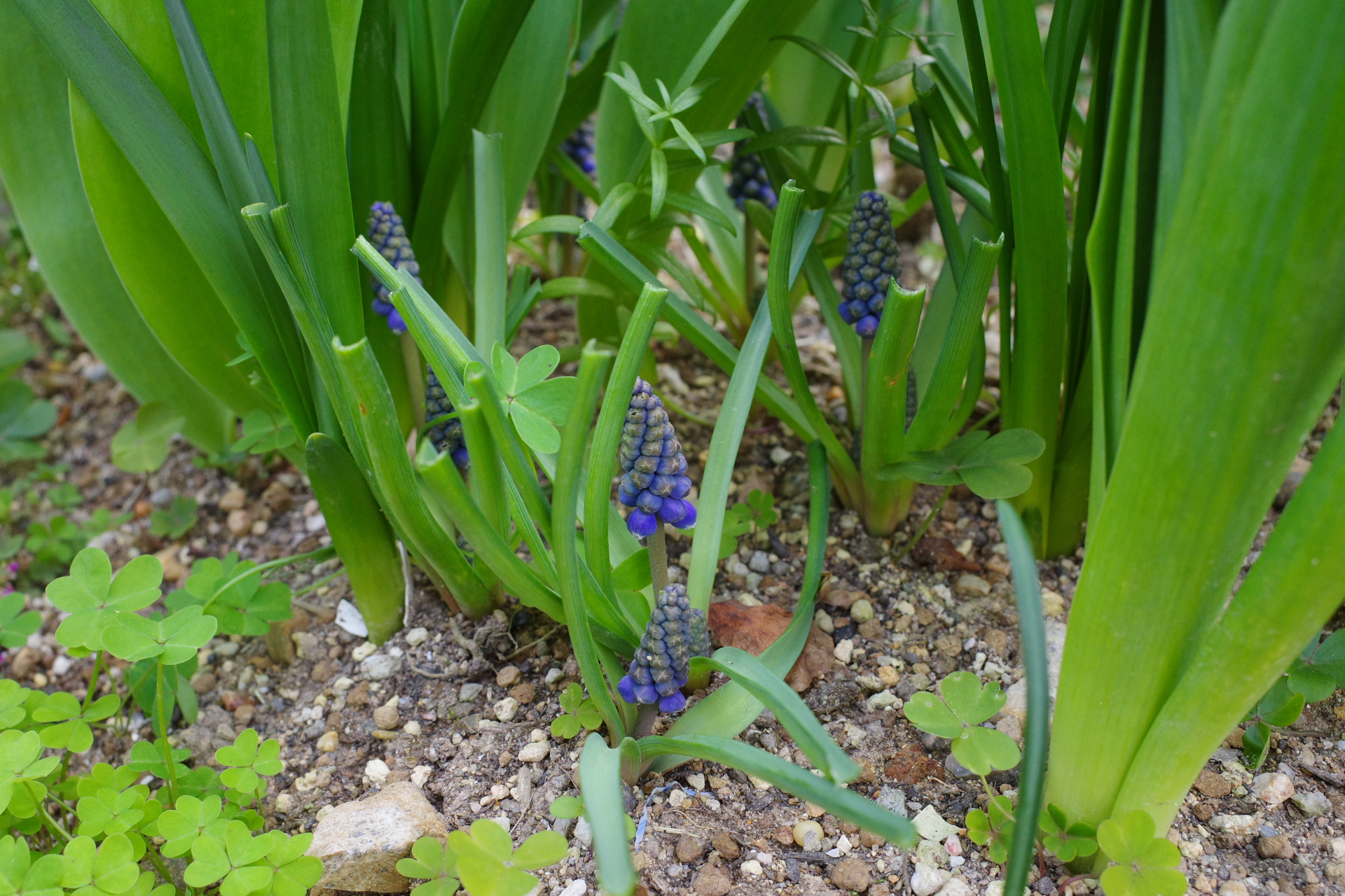 ニホンスイセンが咲き終わって、白房水仙とムスカリが咲き始めたところ。生ごみ堆肥入りで日がよく当たるので、去年より丈夫に育っているけど、雑多な感じで花が綺麗に見えません。球根の投げ植えするなら草丈を合わせるのがコツかも?